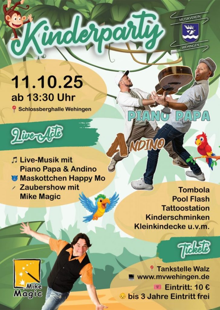 Die bekannte Kinderparty des Musikverein Wehingen geht in die dritte Runde! Am Samstag, den 11.10.2025 feiern wir mit den Kleinen und ganz Kleinen in der Schlossberghalle eine Party, bei der garantiert alle auf ihre Kosten kommen.
