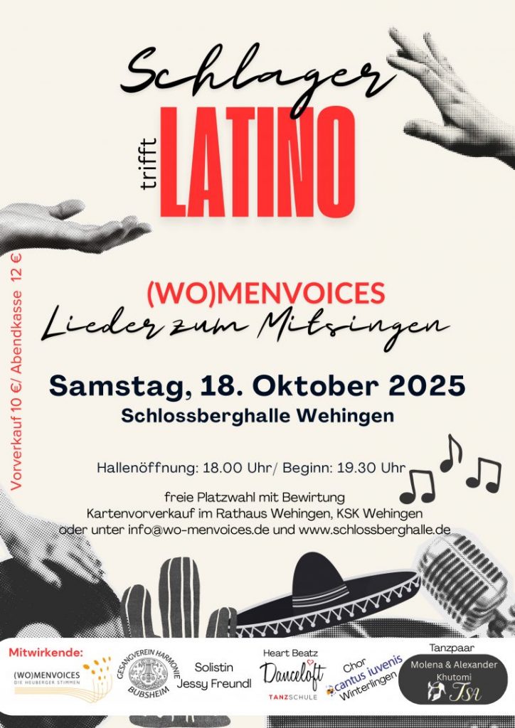 „Schlager trifft Latino“ – unter diesem schwungvollen Motto laden die (WO)MENVOICES zu ihrem diesjährigen Jahreskonzert am 18.10.2025 in die Schlossberghalle ein!