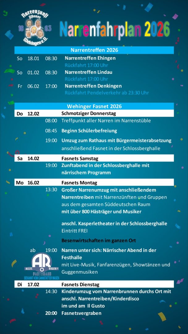 Auch diese Fasnet können wir allen Narren sowohl am Schmotzigen Donnerstag, am Zunftabend und auch am Fasnetsmontag wieder einen kostenlosen Heimfahrservice in Wehingen und Harras anbieten. Wie in den Jahren zuvor, wird auch dieses Jahr unser Hauptsponsor Thomas Rees von der Fa. Rees Zerspanungstechnik GmbH die Kosten für diesen Heimfahrservice übernehmen.